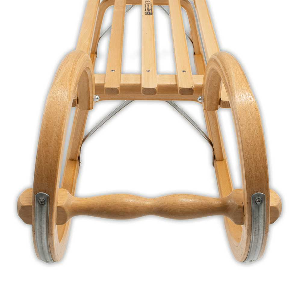 Kufen und Böcke des Schlittens sind aus verleimtem Buchen-Formholz, die Kufen Halbrundeisen aus verzinktem Stahl. Alle Komponenten sind mit verzinkten Schrauben verbunden. Der Schlitten ist mit ökologisch unbedenklichem Tauchlack versiegelt, der Lattensatz besteht aus Buche-Massivholzleisten. Der Schlitten ist TÜV und GS geprüft.