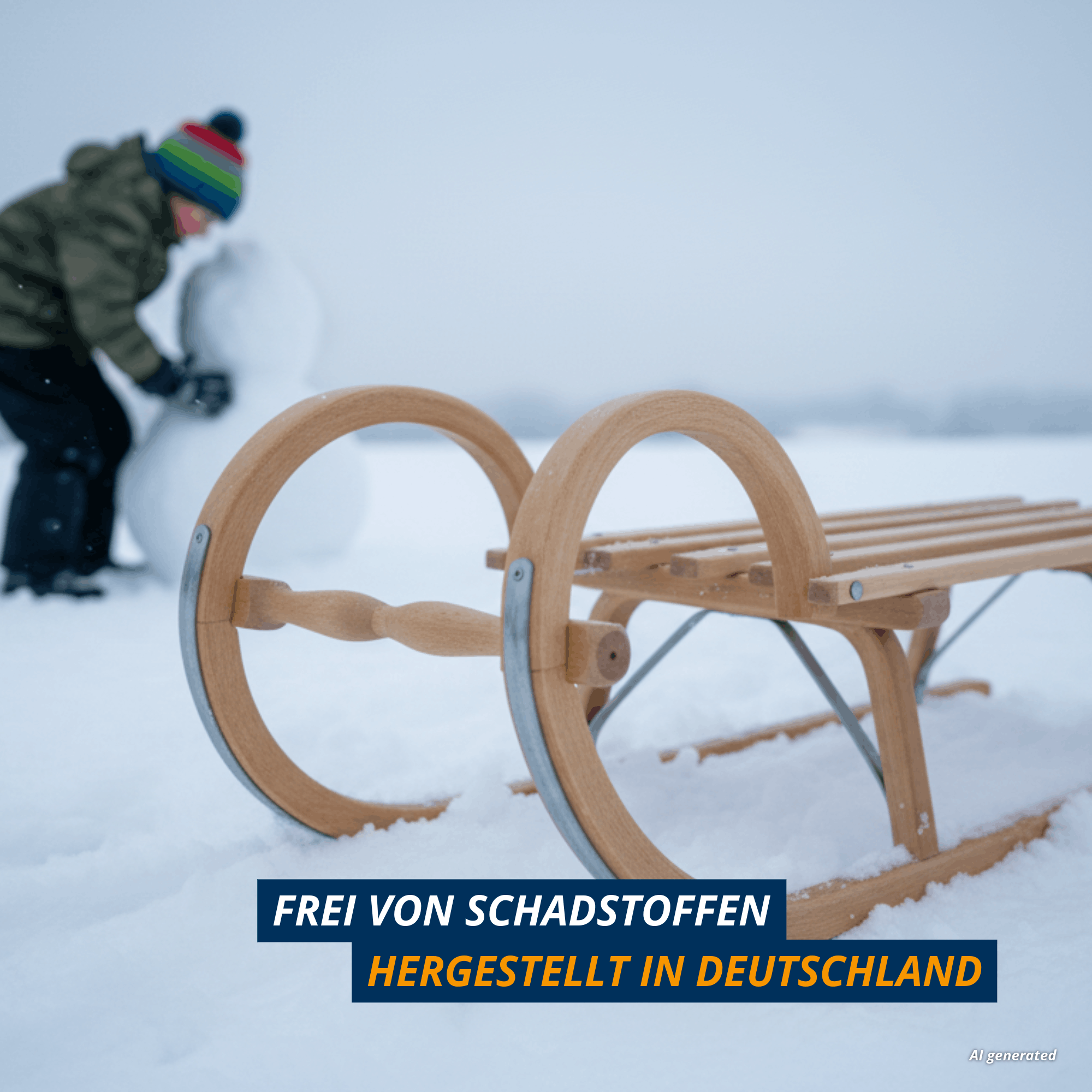 Der Holzrodel besteht aus robustem, sorgfältig verarbeitetem Buchenholz, das mit einem ökologisch unbedenklichen Tauchlack versiegelt ist. Dadurch ist der Schlitten winterfest, trocken und besonders widerstandsfähig. Die verzinkten Stahlkufen und Stützeisen sorgen für ruhigen Lauf, hohe Spurtreue und Schutz vor Rost – auch bei intensiver Nutzung im Schnee.