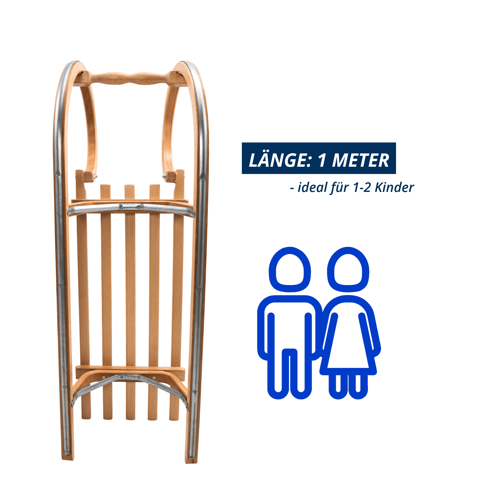 Mit einer Länge von 100 cm ist der Gebirgsrodel ideal für ein bis zwei Kinder geeignet. Der Schlitten ist in verschiedenen Varianten erhältlich und kann mit passendem Zubehör wie Zugband oder Schlittenlehne für Kleinkinder ergänzt werden.