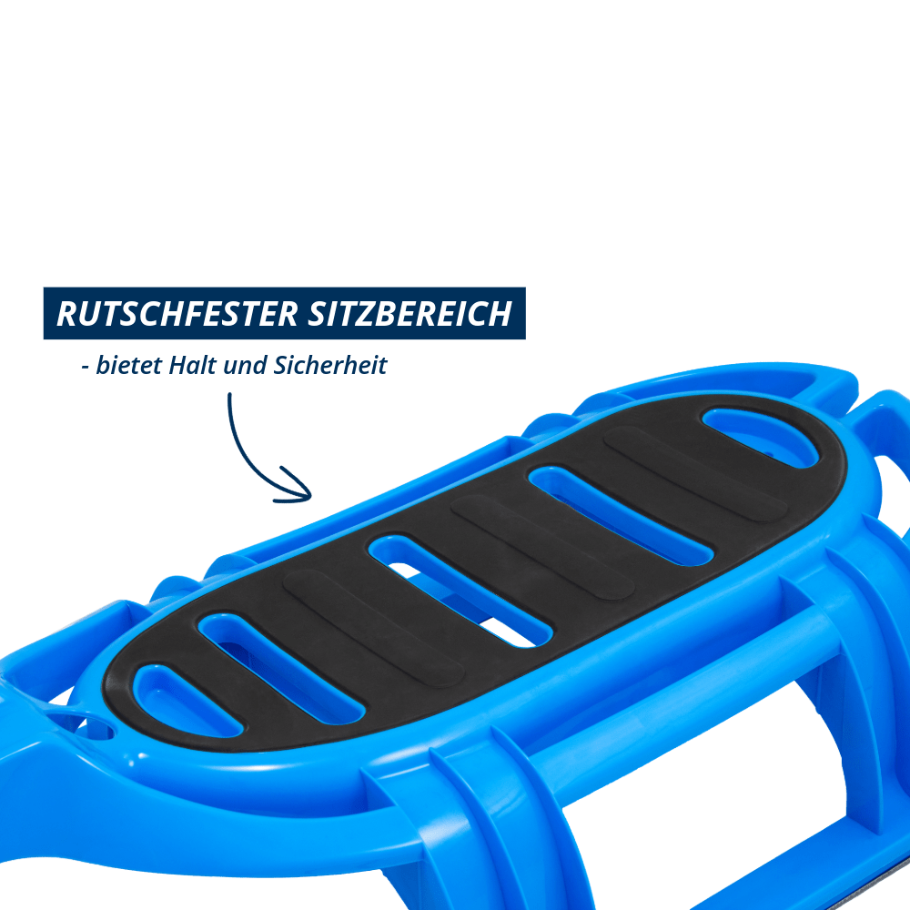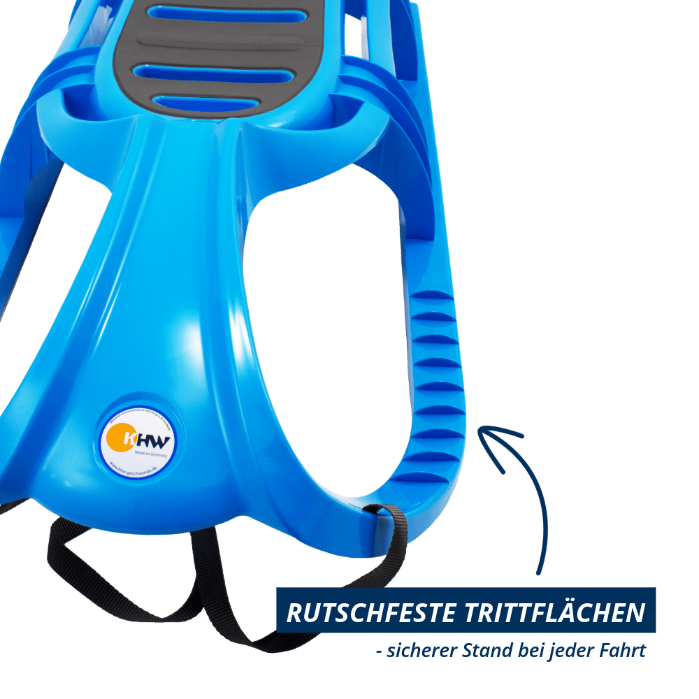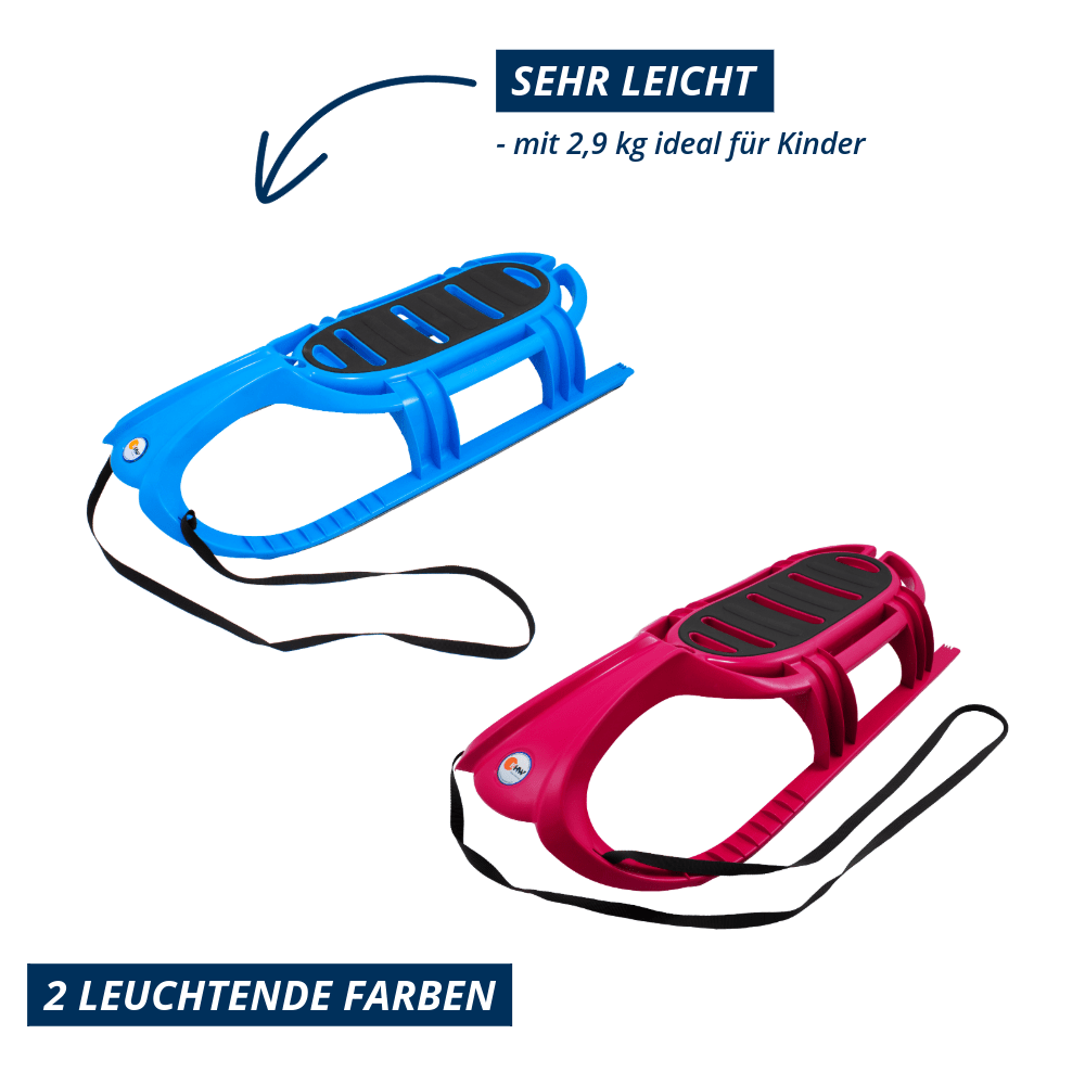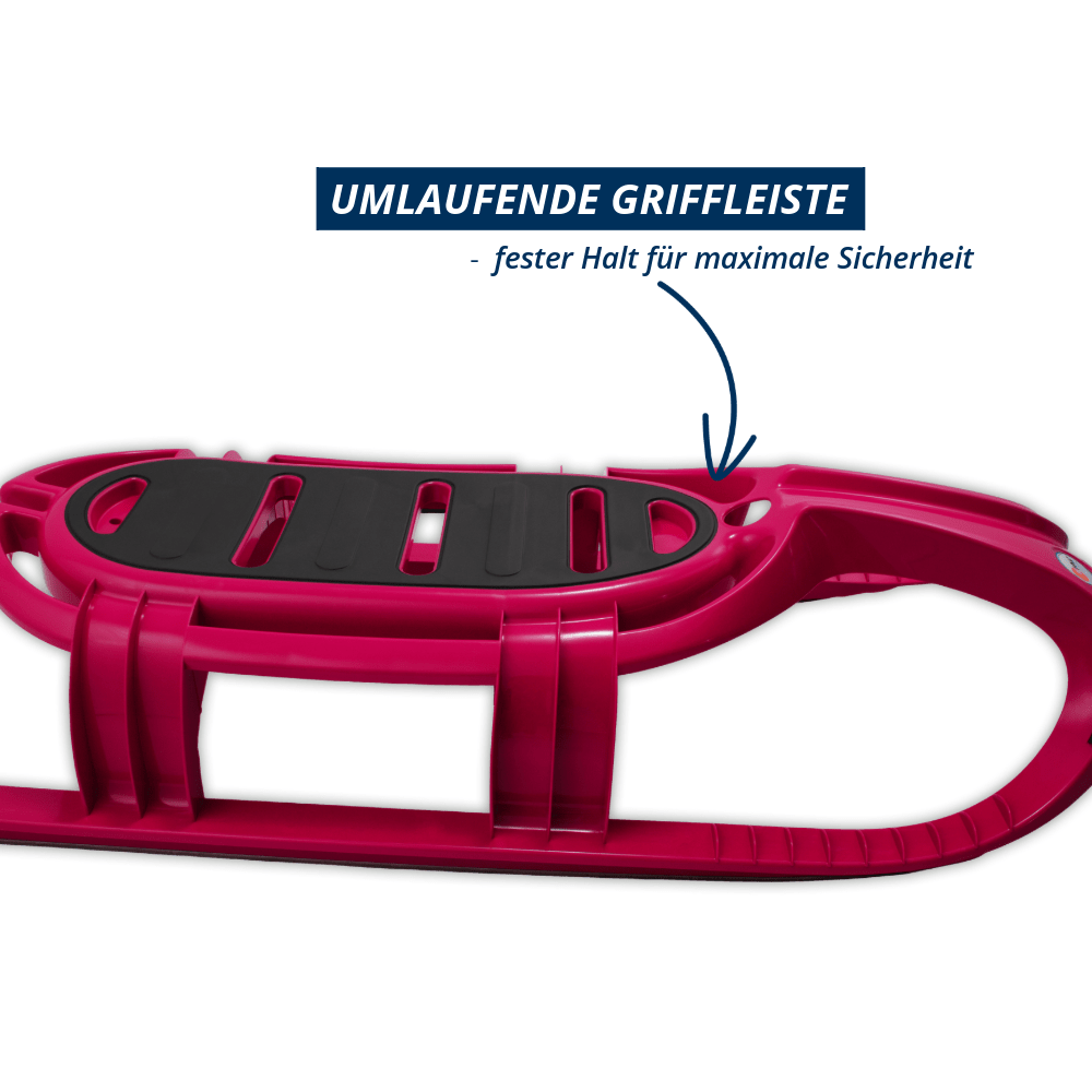 Die elegante und farbenfrohe Alternative zum Holzrodel hat ein innovatives Design ohne Ecken und Kanten und ist extrem leicht. Seine innenlaufenden Edelstahlkufen garantieren sehr gute Gleiteigenschaften. Der rutschsicherer Sitzbereich, profilierte Fußablagen und eine umlaufende Griffleiste sorgen für Halt und maximale Sicherheit in jeder Lage. Dem hochwertigen, pflegeleichten Kunststoff kann die Kälte auf der Rodelspiste und eine hohe Sonneneinstrahlung nichts anhaben.